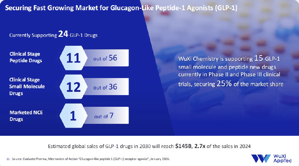 目前,药明康德已深度嵌入全球GLP-1创新生态。截至目前,公司正为全球24款GLP-1药物提供支持(涵盖12款小分子药物、11款多肽药物及1个商业化药物)。其中,有15款已推进至临床Ⅱ/Ⅲ期关键阶段,占据了全球临床后期GLP-1管线约25%的市场份额。