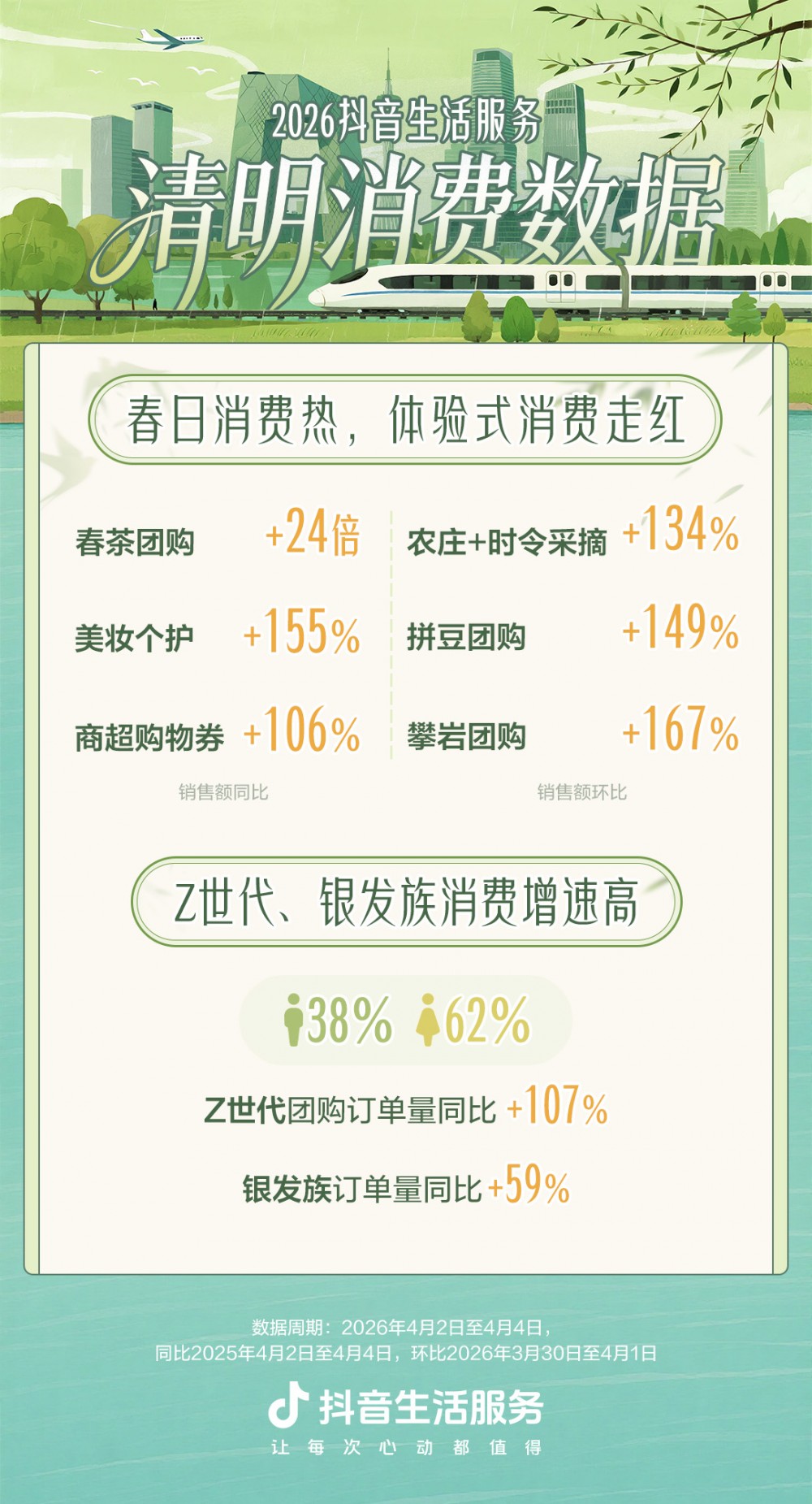 (原标题:清明假期春日焕新消费火热,服饰美妆抖音团购销售额同比增长超100%)