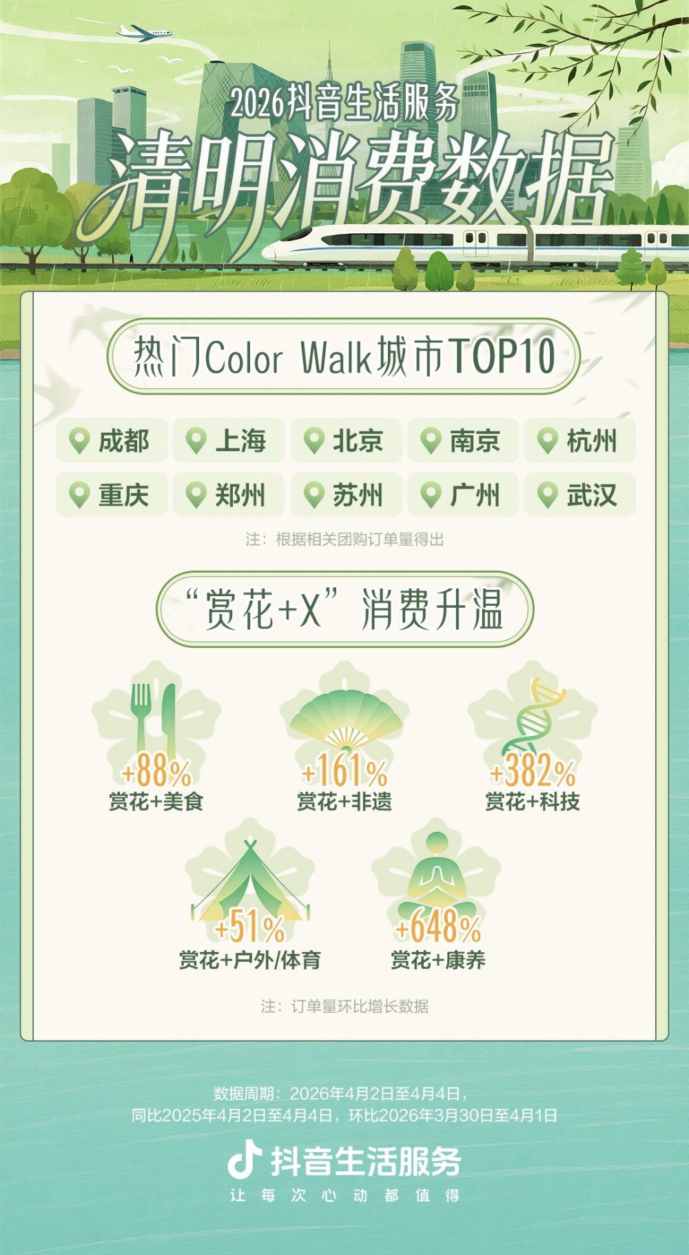 清明假期落幕,赏花游、乡村游、体验式消费迎来高潮。抖音生活服务清明消费数据显示,“春日Color Walk”相关话题突破7.5亿次,假期抖音团购销售额同比增长54%。其中,餐饮团购销售额同比增长超42%,休闲娱乐相关团购销售额同比增长76%,酒旅团购销售额同比增长38%、环比节前增长54%。赏花踏青之外,餐饮、住宿、休闲娱乐、零售等多业态消费也在同步升温。
