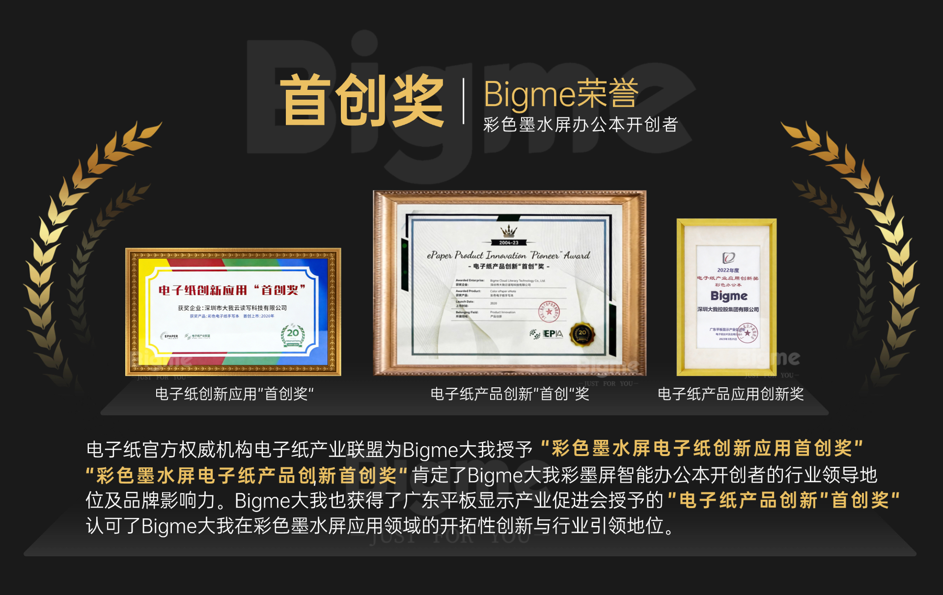 且在2020年,Bigme大我就已经相继拿下了官方权威机构电子纸产业联盟为Bigme大我授予的“彩色墨水屏电子纸创新应用首创奖”、“彩色墨水屏电子纸产品创新首创奖”以及2022年广东平板显示产业促进会授予的“电子纸产品创新首创奖”,现已发展成为彩色墨水屏幕行业的领军品牌