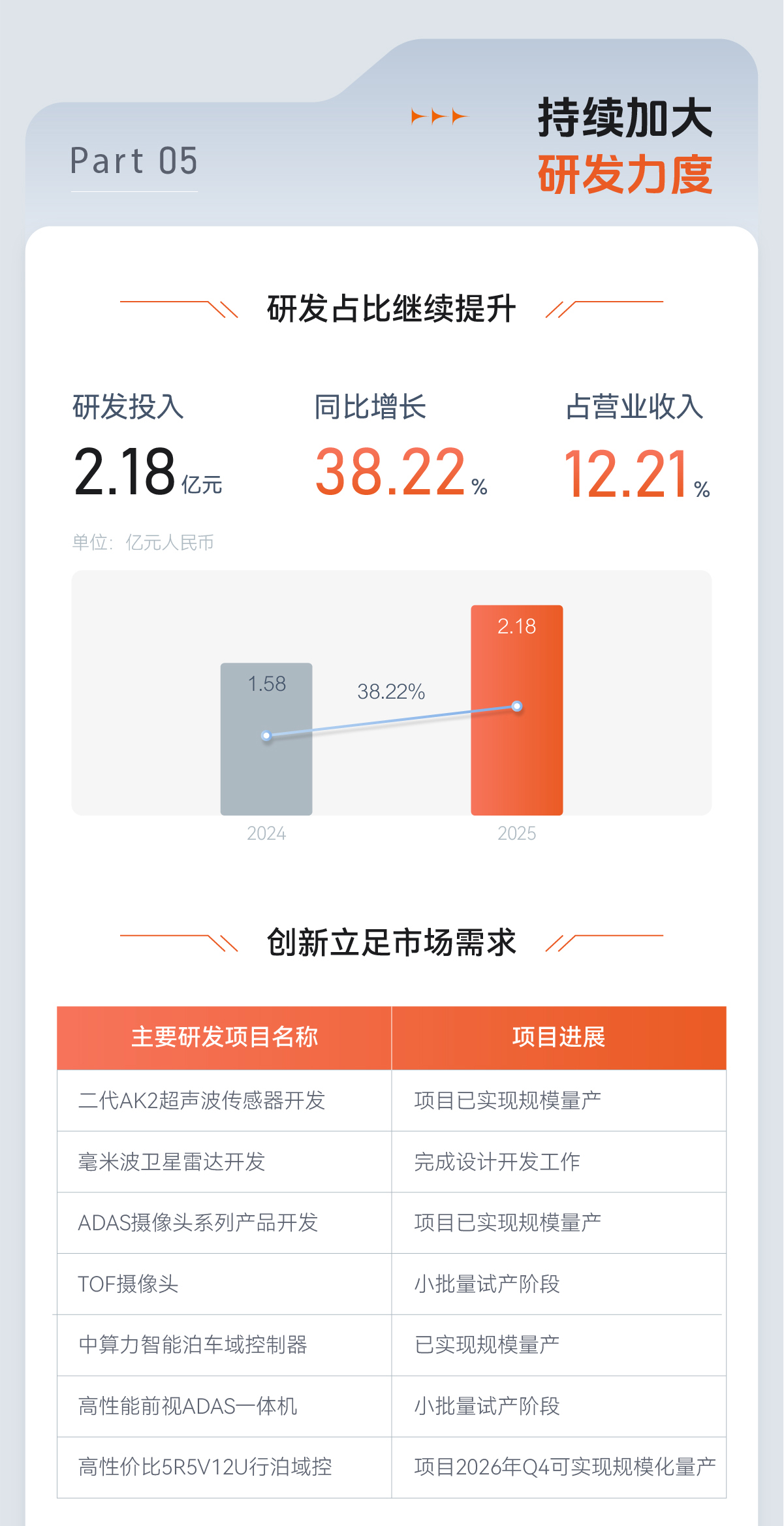 近期,豪恩汽电(301488.SZ)发布公司2025年年度报告,公司2025年营业收入17.88亿元,同比增长26.26%,计划分红每10股派发4元现金红利,分红总额达3680万元。据悉,豪恩汽电产品涵盖智能驾驶领域、机器人领域及低空经济领域的核心感知与决策产品,主要包括集软件、算法、光学设计和硬件于一体的视觉感知系统、雷达感知系统和域控制器系统等。