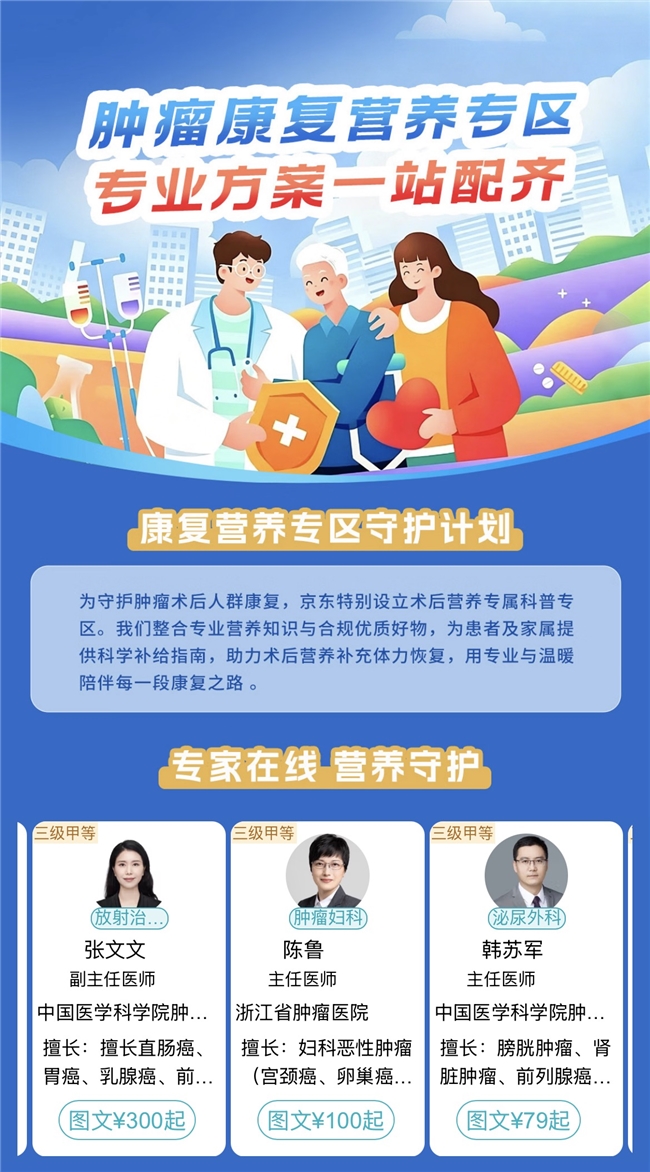 依托多年在肿瘤专科领域的持续深耕,京东互联网医院肿瘤专科目前已覆盖全国百家肿瘤专科医院及综合医院肿瘤科,汇聚超3万名专家,构建起从报告解读、多学科会诊、治疗方案制定到康复随访的全流程服务体系,实现医生24小时在线、平均30秒接诊。在第32个全国肿瘤防治宣传周到来之际,从科普预防到精准诊疗,从AI赋能到营养康复,京东互联网医院以实际行动响应“肿瘤防治,赢在整合”的号召,为构建全社会共同参与的癌症防治格局贡献互联网医疗力量。即日起,用户打开京东APP搜索“肿瘤防治”,即可直达防治周活动专区。