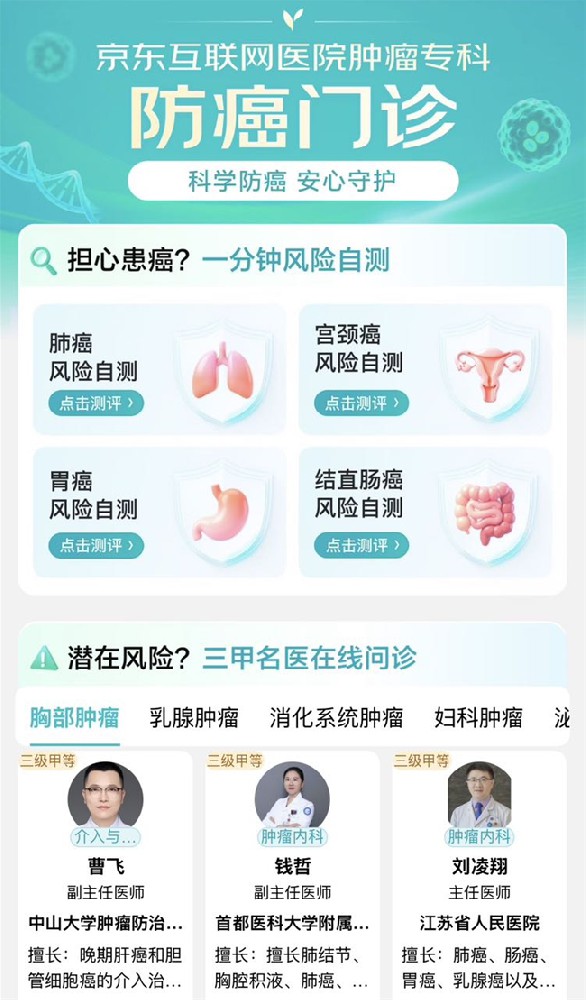 更重要的是,京东互联网医院肿瘤专科正式上线“防癌门诊”,覆盖胸部肿瘤、乳腺肿瘤、消化系统肿瘤、妇科肿瘤、泌尿系统肿瘤、头颈肿瘤等多个高发癌种,汇聚三甲名医资源,为高危人群提供风险自测、在线问诊、防癌体检、专家科普的全流程服务。不同于常规线上门诊,防癌门诊基于线下真实就医需求搭建,集合专家推荐、肿瘤筛查、健康科普、名医直播等多种形式,将“早防早筛”理念融入可操作的服务闭环,让优质筛查资源突破地域限制,惠及更广泛人群。