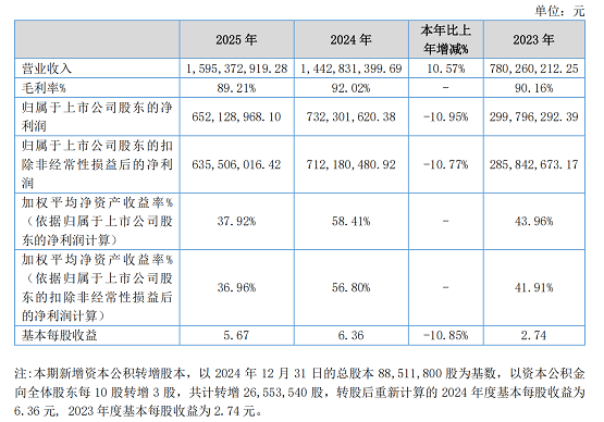 2025年,锦波生物实现营业收入15.95亿元,同比增长10.57%。综合毛利率89.21%,维持在较高水平。总资产25.83亿元,归母净资产18.95亿元,分别增长25.62%和23.39%。