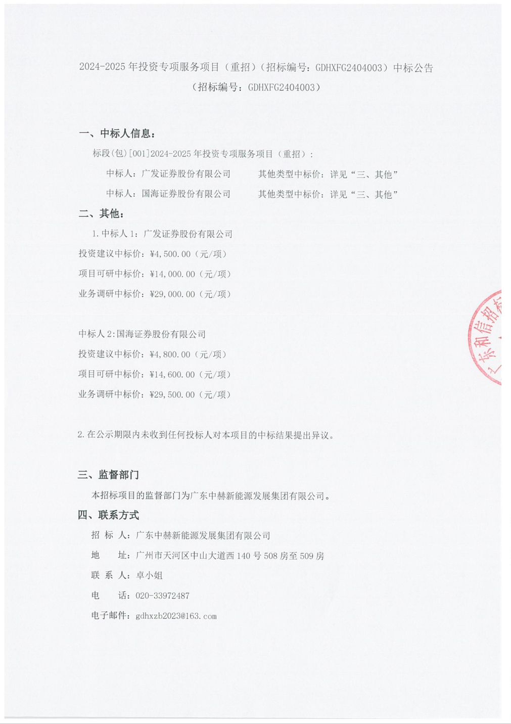 证券之星消息,根据企查查信息整理,7月15日公布的《2024-2025年投资专项服务项目(重招)(招标编号:GDHXFG2404003)中标公告》中显示广发证券股份有限公司中标。公告内容如下: