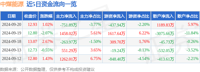 证券之星消息,截至2024年9月20日收盘,中煤能源(601898)报收于12.93元,上涨1.02%,换手率0.17%,成交量15.49万手,成交额1.99亿元。