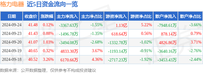 证券之星消息,截至2024年9月24日收盘,格力电器(000651)报收于41.48元,上涨0.12%,换手率0.95%,成交量52.66万手,成交额21.69亿元。