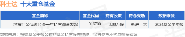 根据2024基金半年报公募基金重仓股数据,重仓该股的公募基金共1家,其中持有数量最多的公募基金为渤海汇金低碳经济一年持有混合发起。渤海汇金低碳经济一年持有混合发起目前规模为0.13亿元,最新净值0.5233(9月27日),较上一交易日上涨5.97%,近一年下跌28.67%。该公募基金现任基金经理为滕祖光。滕祖光在任的基金产品包括:渤海汇金优选价值混合发起A,管理时间为2024年7月30日至今,期间收益率为nan%。