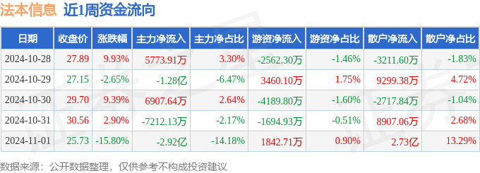 资金流向数据方面,本周法本信息主力资金合计净流出3.65亿元,游资资金合计净流出3144.23万元,散户资金合计净流入3.96亿元。本周资金流向一览见下表: