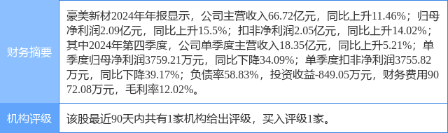 2025年3月31日,天风证券研究员鲍荣富,刘奕町,王涛发布了对豪美新材的研报《汽车轻量化业务快速放量,系统门窗成长韧性凸显》,该研报对豪美新材给出“买入”评级。研报中预计公司2025-2027年归母净利润为2.4、2.7、3亿(前值25、26年预测为3.1、4.1亿),对应PE为25、22、20倍,维持“买入”评级。证券之星数据中心根据近三年发布的研报数据计算,该研报作者对此股的盈利预测准确度为79.32%。