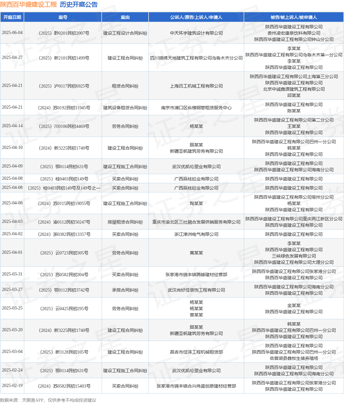 案号:(2025)川0106民初4469号根据统计,近一年内以陕西百华盛建设工程有限公司为当事人的历史开庭公告有71则,其中案由为“买卖合同纠纷”的公告以19则居首,其次为“建设工程施工合同纠纷”有14则,“劳务合同纠纷”有7则。历史开庭公告(前20条)如下: