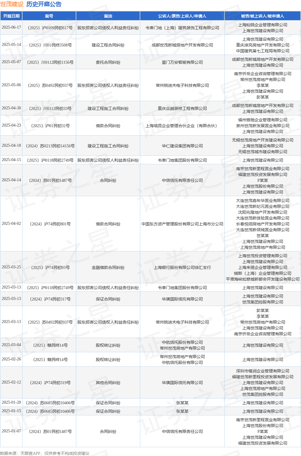 案号:(2024)苏0213民初14156号根据统计,近一年内以上海世茂建设有限公司为当事人的历史开庭公告有96则,其中案由为“金融借款合同纠纷”的公告以32则居首,其次为“借款合同纠纷”有9则,“建设工程合同纠纷”有8则。历史开庭公告(前20条)如下: