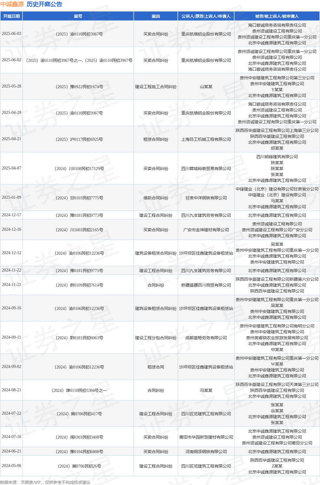 案号:(2025)渝0110民初3967号根据统计,近一年内以北京中诚鑫源建筑工程有限公司为当事人的历史开庭公告有20则,其中案由为“买卖合同纠纷”的公告以7则居首,其次为“建设工程合同纠纷”有4则,“合同纠纷”有2则。历史开庭公告如下: