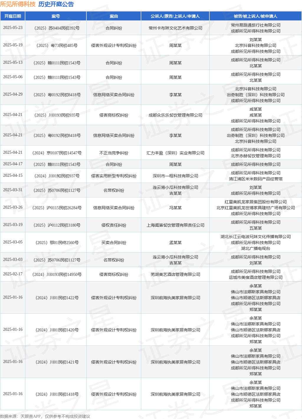 案号:(2025)赣0111民初1543号根据统计,近一年内以成都所见所得科技有限公司为当事人的历史开庭公告有56则,其中案由为“侵害商标权纠纷”的公告以10则居首,其次为“侵害外观设计专利权纠纷”有8则,“合同纠纷”有7则。历史开庭公告(前20条)如下:
