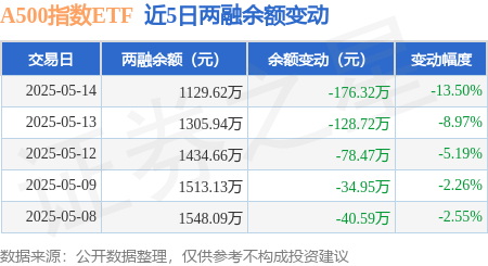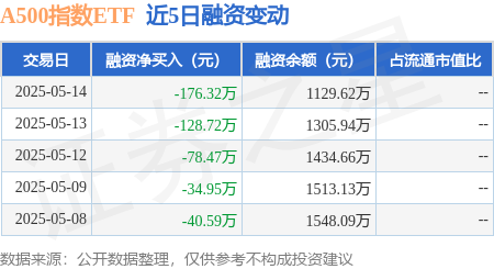 证券之星消息,5月14日,A500指数ETF(560610)融资买入95.86万元,融资偿还272.18万元,融资净卖出176.32万元,融资余额1129.62万元。