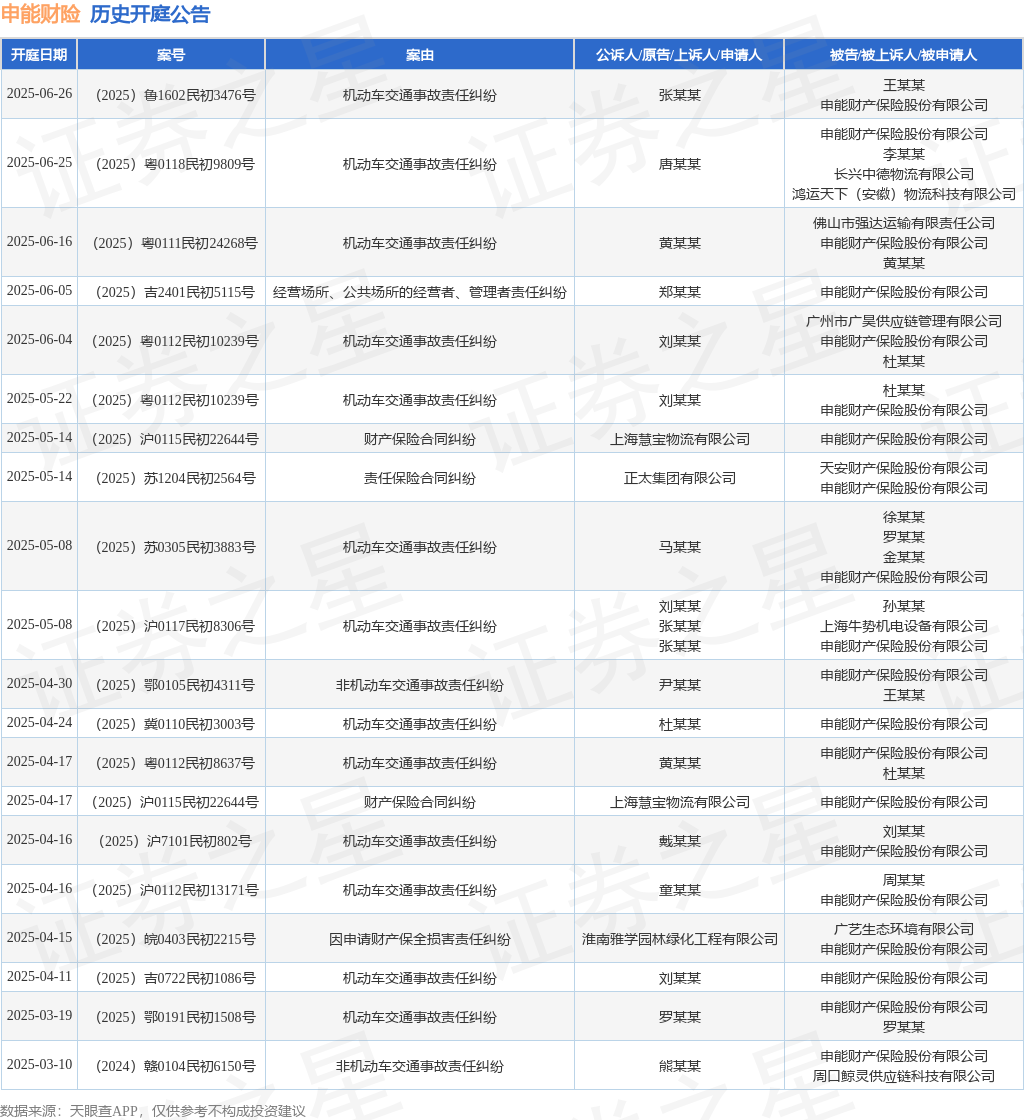 案号:(2025)粤0112民初10239号根据统计,近一年内以申能财产保险股份有限公司为当事人的历史开庭公告有26则,其中案由为“机动车交通事故责任纠纷”的公告以18则居首,其次为“财产保险合同纠纷”有2则,“非机动车交通事故责任纠纷”有2则。历史开庭公告(前20条)如下: