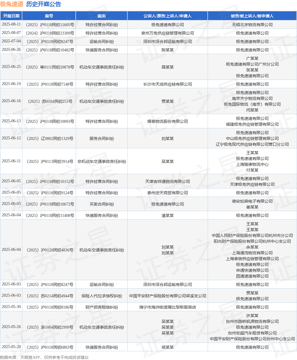 案号:(2025)沪0113民初3914号根据统计,近一年内以极兔速递有限公司为当事人的历史开庭公告有148则,其中案由为“特许经营合同纠纷”的公告以65则居首,其次为“快递服务合同纠纷”有14则,“机动车交通事故责任纠纷”有14则。历史开庭公告(前20条)如下: