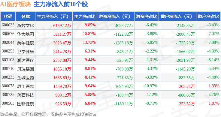 从资金流向上来看,当日AI医疗板块主力资金净流入6043.33万元,游资资金净流出1.17亿元,散户资金净流入5692.23万元。AI医疗板块个股资金流向见下表: