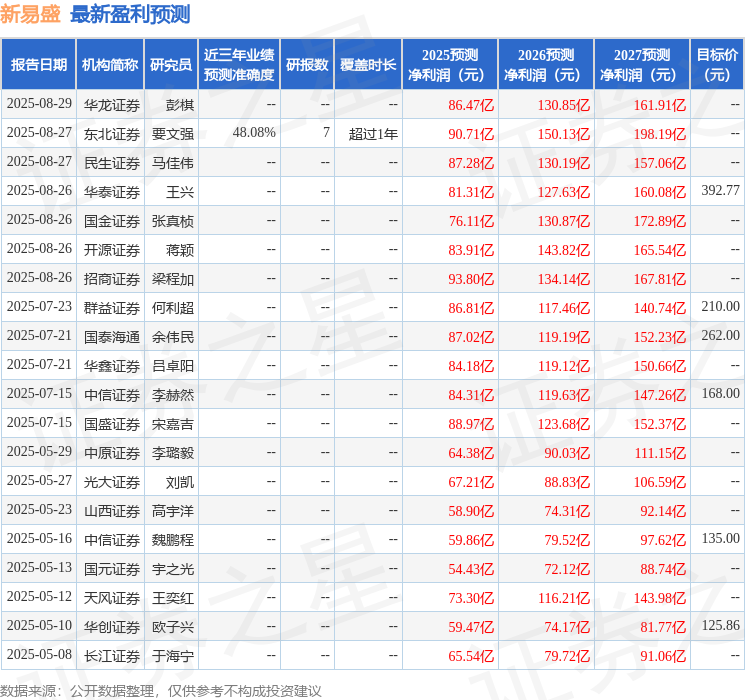 最新盈利预测明细如下: