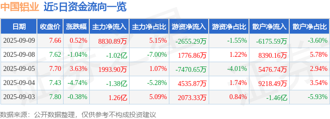 证券之星消息,截至2025年9月9日收盘,中国铝业(601600)报收于7.66元,上涨0.52%,换手率1.69%,成交量222.45万手,成交额17.16亿元。