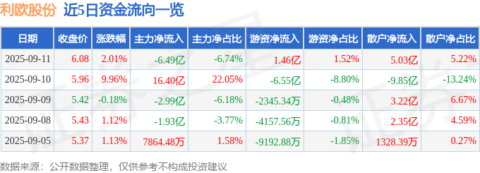 9月11日的资金流向数据方面,主力资金净流出6.49亿元,占总成交额6.74%,游资资金净流入1.46亿元,占总成交额1.52%,散户资金净流入5.03亿元,占总成交额5.22%。