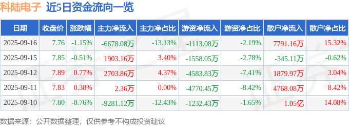 证券之星消息,截至2025年9月16日收盘,科陆电子(002121)报收于7.76元,下跌1.15%,换手率4.72%,成交量66.11万手,成交额5.08亿元。