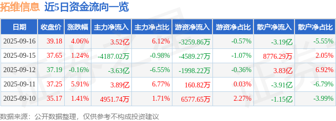 证券之星消息,截至2025年9月16日收盘,拓维信息(002261)报收于39.18元,上涨4.06%,换手率13.03%,成交量149.35万手,成交额57.48亿元。