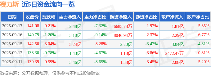 9月17日的资金流向数据方面,主力资金净流出2.48亿元,占总成交额7.32%,游资资金净流入6685.78万元,占总成交额1.97%,散户资金净流入1.81亿元,占总成交额5.35%。