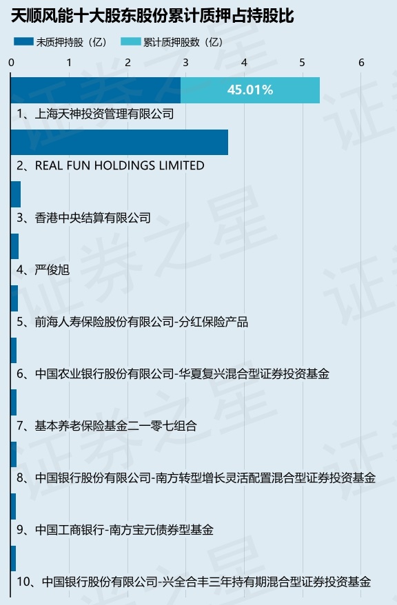 截止本公告日,股东上海天神投资管理有限公司已累计质押股份2.39亿股,占其持股总数的45.01%。本次质押后天顺风能十大股东的累计质押股份占持股比例(占持股比例的计算以公司最新一期财务报表公布的十大股东的持股总数为基准)见下图: