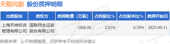 证券之星消息,天顺风能(002531)9月18日公开信息显示,股东上海天神投资管理有限公司向国联民生证券股份有限公司合计质押1066.0万股,占总股本0.59%。质押详情见下表:
