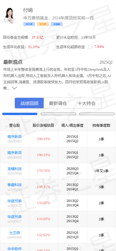 毛戈平(01318)是基金经理付娟的重仓股。,其在整个职业生涯内年化收益高达15.37%。付娟的大佬持仓 - 战绩回顾截图如下:
