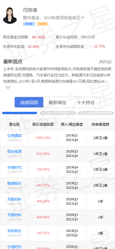 豪能股份(603809)是基金经理闫思倩的重仓股。,其在整个职业生涯内年化收益高达22.3%。闫思倩的大佬持仓 - 战绩回顾截图如下:
