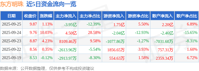 9月25日的资金流向数据方面,主力资金净流出3.95亿元,占总成交额12.39%,游资资金净流入1.75亿元,占总成交额5.5%,散户资金净流入2.2亿元,占总成交额6.89%。