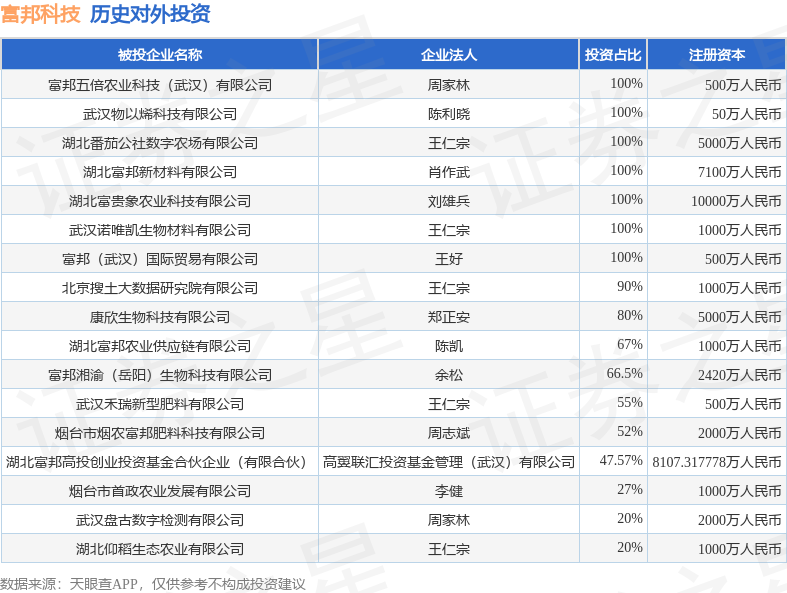 证券之星消息,根据天眼查APP显示,富邦科技(300387.SZ)新增一起对外投资事件,被投资公司为富邦五倍农业科技(武汉)有限公司,法定代表人周家林,投资占比为100%。该公司从事研究和试验发展,注册资本为500万人民币。目前,富邦科技共存在对外投资17项,详见下表: