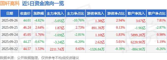 9月26日的资金流向数据方面,主力资金净流出5.05亿元,占总成交额10.76%,游资资金净流入1.38亿元,占总成交额2.94%,散户资金净流入3.67亿元,占总成交额7.81%。