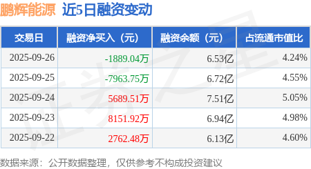 证券之星消息,9月26日,鹏辉能源(300438)融资买入2.45亿元,融资偿还2.64亿元,融资净卖出1889.04万元,融资余额6.53亿元。