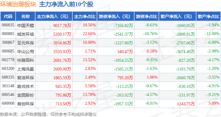 从资金流向上来看,当日环境治理板块主力资金净流出9491.72万元,游资资金净流出1.27亿元,散户资金净流入2.22亿元。环境治理板块个股资金流向见下表: