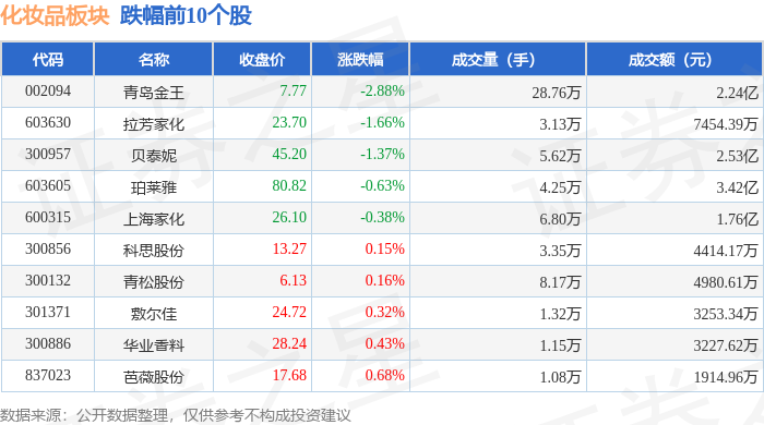 证券之星消息,9月29日化妆品板块较上一交易日下跌0.13%,青岛金王领跌。当日上证指数报收于3862.53,上涨0.9%。深证成指报收于13479.43,上涨2.05%。化妆品板块个股涨跌见下表: