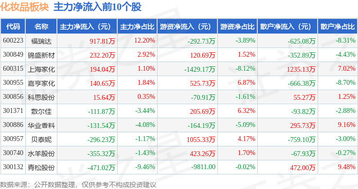 从资金流向上来看,当日化妆品板块主力资金净流出1.04亿元,游资资金净流入4552.95万元,散户资金净流入5859.11万元。化妆品板块个股资金流向见下表: