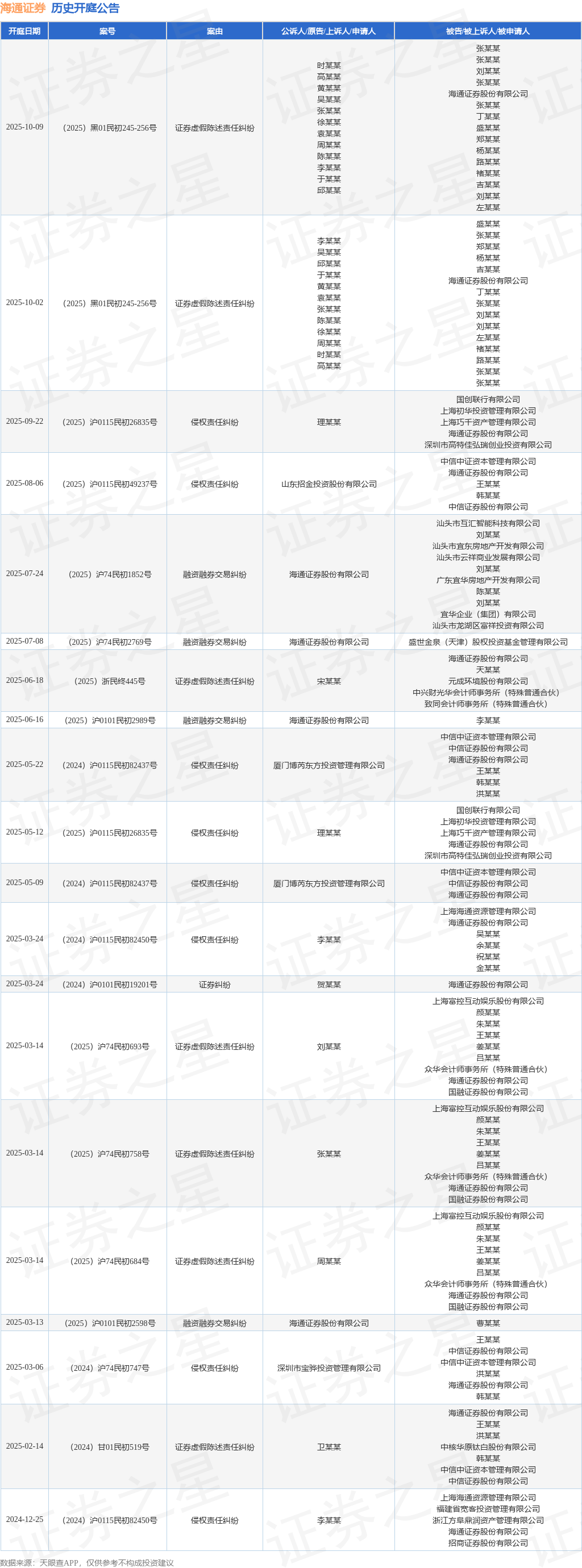 案号:(2025)黑01民初245-256号根据统计,近一年内以海通证券股份有限公司为当事人的历史开庭公告有29则,其中案由为“侵权责任纠纷”的公告以11则居首,其次为“证券虚假陈述责任纠纷”有8则,“融资融券交易纠纷”有4则。历史开庭公告(前20条)如下: