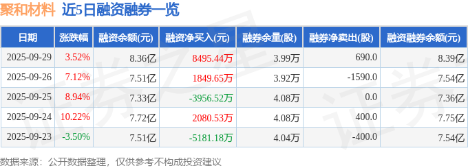 证券之星消息,截至2025年9月29日收盘,聚和材料(688503)报收于83.0元,上涨3.52%,换手率16.35%,成交量29.54万手,成交额23.73亿元。