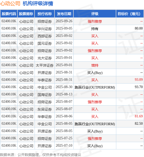 投行对该股的评级以买入为主,近90天内共有7家投行给出买入评级,近90天的目标均价为86.2港元。招商证券最新一份研报给予心动公司强烈推荐评级。