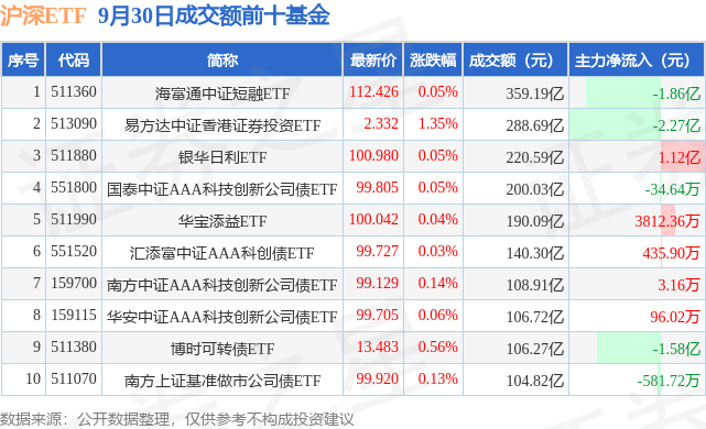 当日沪深ETF成交额前10大ETF基金全线收涨,平均涨幅0.25%,其中短融ETF(511360)以成交额359.19亿元排第一。从主力资金流入看,成交额前10大ETF基金中有5只ETF基金呈现主力资金净流入。