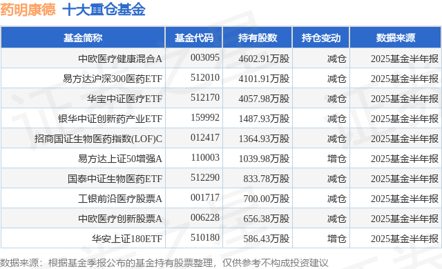 根据2025基金半年报公募基金重仓股数据,重仓该股的公募基金共359家,其中持有数量最多的公募基金为中欧基金的中欧医疗健康混合A。中欧医疗健康混合A目前规模为156.38亿元,最新净值2.0364(9月29日),较上一交易日下跌0.18%,近一年上涨29.02%。该公募基金现任基金经理为葛兰 赵磊。葛兰在任的基金产品包括:中欧明睿新起点混合,管理时间为2018年7月12日至今,期间收益率为81.64%;中欧医疗创新股票A,管理时间为2019年2月28日至今,期间收益率为73.36%。