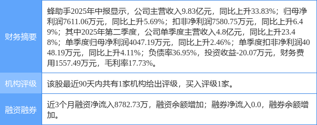今日蜂助手(301382)涨6.01%,收盘报37.76元。
