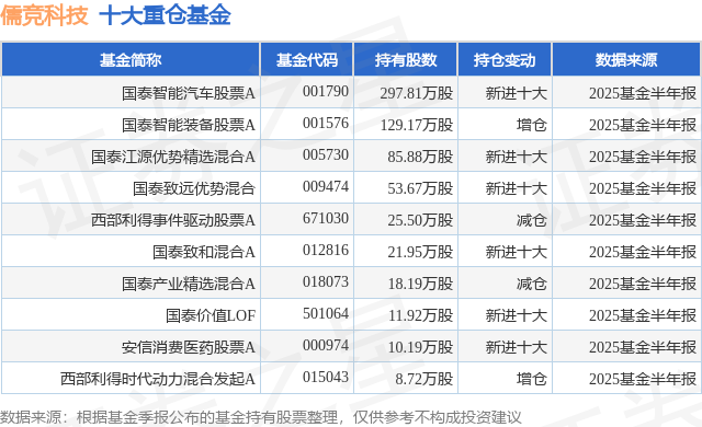 根据2025基金半年报公募基金重仓股数据,重仓该股的公募基金共13家,其中持有数量最多的公募基金为国泰基金的国泰智能汽车股票A。国泰智能汽车股票A目前规模为36.78亿元,最新净值2.563(9月29日),较上一交易日上涨4.0%,近一年上涨60.29%。该公募基金现任基金经理为王阳。王阳在任的基金产品包括:国泰智能装备股票A,管理时间为2018年11月13日至今,期间收益率为183.74%;国泰价值精选灵活配置混合A,管理时间为2019年8月15日至今,期间收益率为94.98%;国泰价值先锋股票A,管理时间为2021年3月9日至今,期间收益率为21.16%。