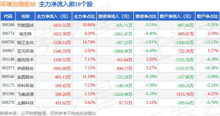 从资金流向上来看,当日环境治理板块主力资金净流出10.9亿元,游资资金净流入3.81亿元,散户资金净流入7.09亿元。环境治理板块个股资金流向见下表: