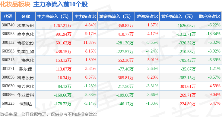 从资金流向上来看,当日化妆品板块主力资金净流出944.4万元,游资资金净流入111.75万元,散户资金净流入832.65万元。化妆品板块个股资金流向见下表:
