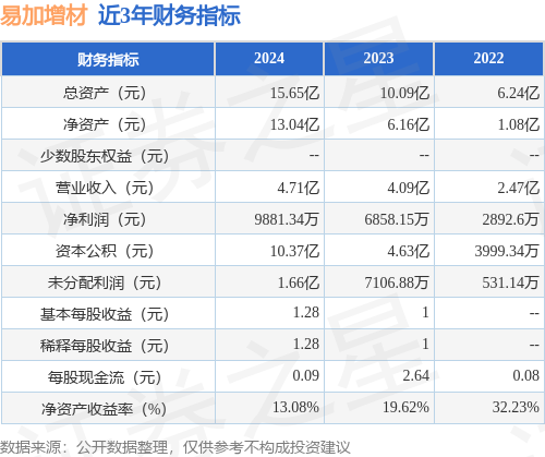 从目前公布的财报来看,易加增材2024年总资产为15.65亿元,净资产为13.04亿元;近3年净利润分别为9881.34万元(2024年),6858.15万元(2023年),2892.6万元(2022年)。详情见下表: