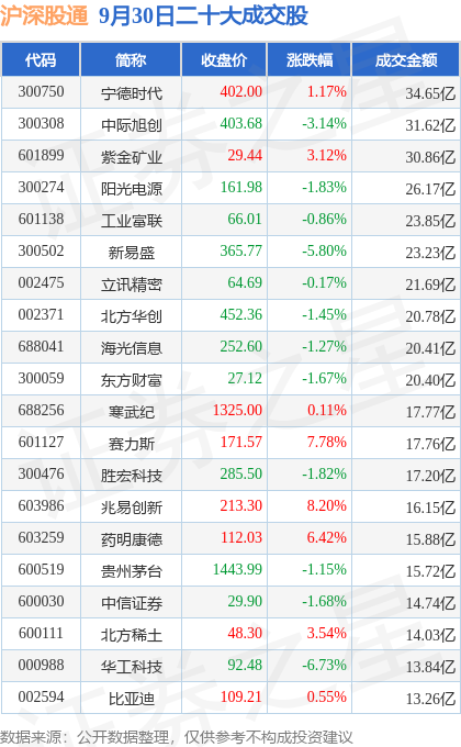 当日北向资金余额额度充足,恒为科技(603496)领涨,涨幅10.02%,交易所公布的沪深股通二十大成交股中成交额前三的为宁德时代、中际旭创、紫金矿业,成交额分别为34.65亿元、31.62亿元、30.86亿元。详情可见下表: